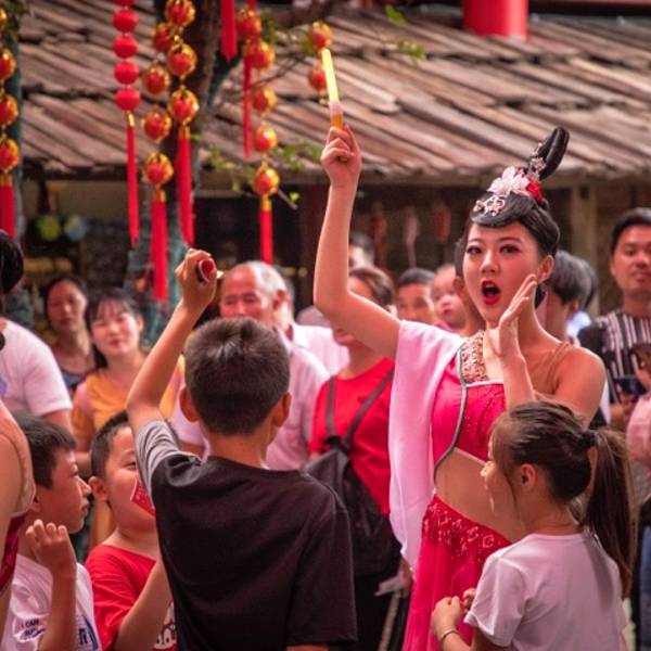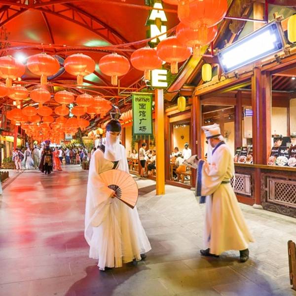 张家界千古情景区位于张家界核心景区武陵源风景名胜区,精彩的演出是千古情的核心体验内容,除了演出还有大庸古街、陶源秘境、情人海、烂苹果亲子乐园四大主题区。觉得千古情更像是为全家出游准备的游乐园。 tips: 每天三个场次的演出为11:30-12:30、16:00-17:00、19:30-20:30。闭园时间为演出后的半小时。 建议直接打的士前往,武陵源区不大,所有的的士基本都在起步价。 大庸古街上熙熙攘攘的人群很是热闹,各式各样的店铺古香古色又充满了现代的元素,时不时穿梭在街上,总有一种穿越的感觉。 走进张家界千古情迎接我的时大庸古街上的是美食小吃、和各式各样的手工作坊云集,近距离感受这条大庸古街特有的魅力,穿梭在古街上的古装美女更加拉近了与大庸古街的距离。 “水上飞人”特技表演也是千古情景区的一大亮点之一。在情人海,都会有精彩的演出,到了景区内一定要先留意公告栏上的表演场次,一定不要错过,踩上“飞行器”的表演者为游客展现了一幕幕精彩的表演。 形形色色的古装人物走上街头,让大庸古街更加的热闹非凡。在这里仿佛穿越一般,我相信,这段短暂的风景也会成为他们生活的点缀,化作一份特殊的体验留在心中。这里充满着快乐的笑声,动感音乐,让你陶醉在这一切当中。 大型歌舞《张家界千古情》浓缩了张家界的历史文化与传奇,精彩的演出是整个千古情的核心,将运用现代高科技机械特效手段进行完美演绎,让游客“穿越”万年时光,感受古老张家界和当代张家界不同时代的美丽景色。