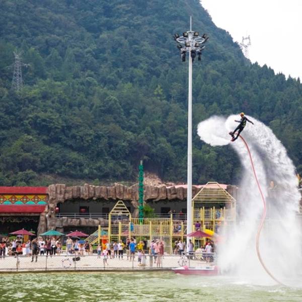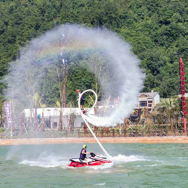 “水上飞人”特技表演也是千古情景区的一大亮点之一。在情人海,都会有精彩的演出,到了景区内一定要先留意公告栏上的表演场次,一定不要错过,踩上“飞行器”的表演者为游客展现了一幕幕精彩的表演。