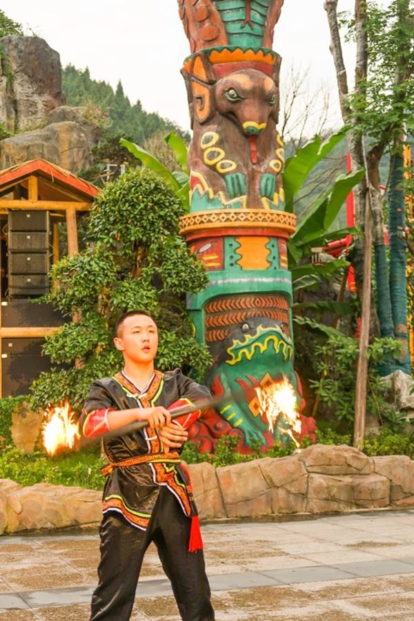 3、看各种小表演,景区在整点会有一些小的表演,通常进行10-15分钟,比如《土司招婿》、《覃将点兵》、《穿越快闪秀》、《水上飞人》、《篝火摆手狂欢》、《泡沫狂欢趴》等等,进景区以后,就能看到LED显示屏上的节目表演时间。