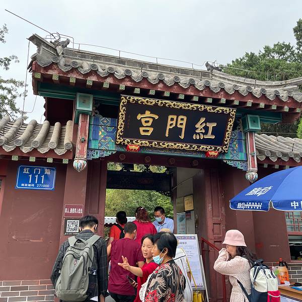 红门宫,位于泰山南麓王母池西北。为攀登泰山之起点,因西北悬崖上有两块红门,形似门扉而得名。宫前建有“一天门”、“孔子登临处”、“天阶”三重石坊;宫内分东西两院,东院正殿三问,原为道教殿堂,后曾供奉弥勒佛,俗称弥勒佛殿。宫后有一巨石耸立,上刻“小泰山”。传为碧霞元君的化身,原有元君小庙,旧时香客多在此焚香祈福,建国后庙毁,1985年重建。