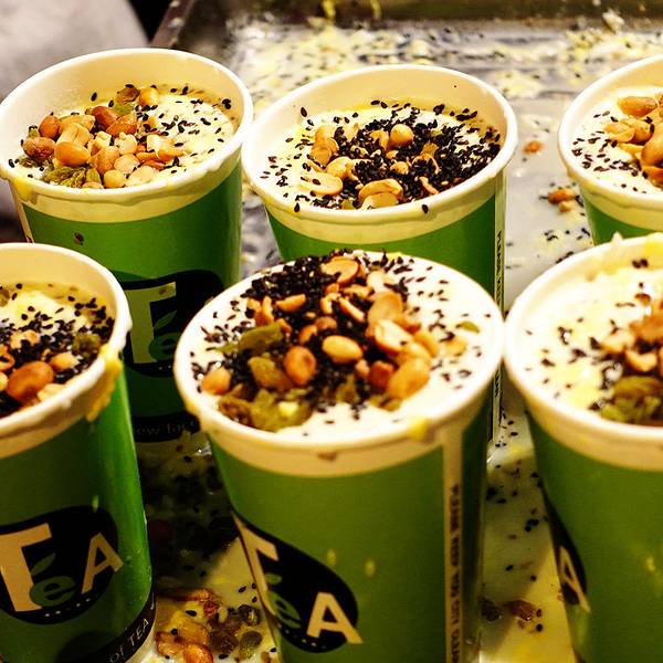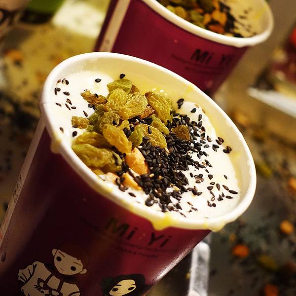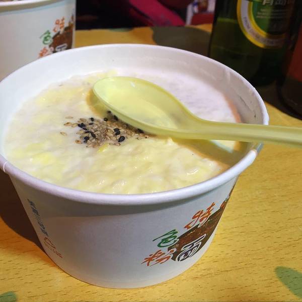 顾名思义,用牛奶、鸡蛋、醪糟一起煮,摊主貌似还放了葡萄干、银耳、芝麻等等。满满的一碗放在面前,纯纯的奶白色,奶和米酒的混合香气让人陶醉,喝一口更是香浓无比(现在写着都快要流口水了,嘿嘿)。平时一般外面卖的醪糟都会加淀粉使其观感浓稠,口感厚重,但这样做无形会让食者摄入过多的淀粉,不是很健康,但不放淀粉又会显得寡淡。用牛奶煮醪糟就很巧妙的解决了这个问题,不仅观感、口感有很大提升,而且更加营养健康,同时在制作的过程中再加入葡萄干、银耳、芝麻等辅料,更是大大增加了其营养价值,口感层次也更加丰富。