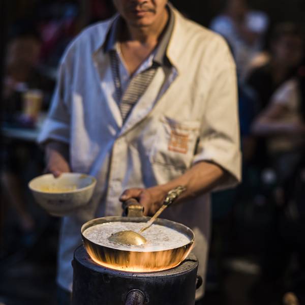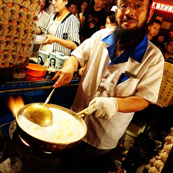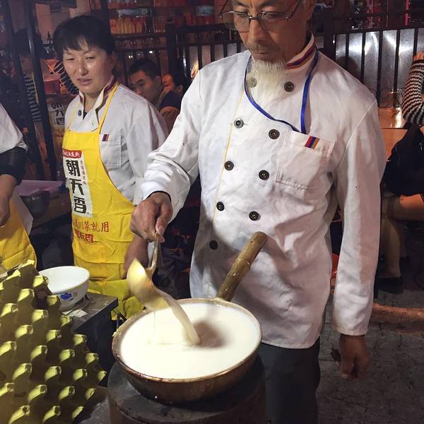 吃完羊肉串,我们往里没走多远,就看到这家店铺,老爷子正在做的就是兰州特色小吃之一——鸡蛋牛奶醪糟。