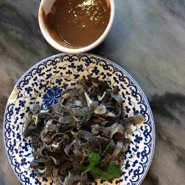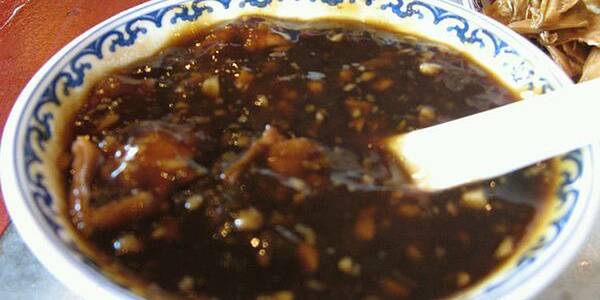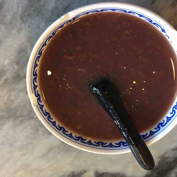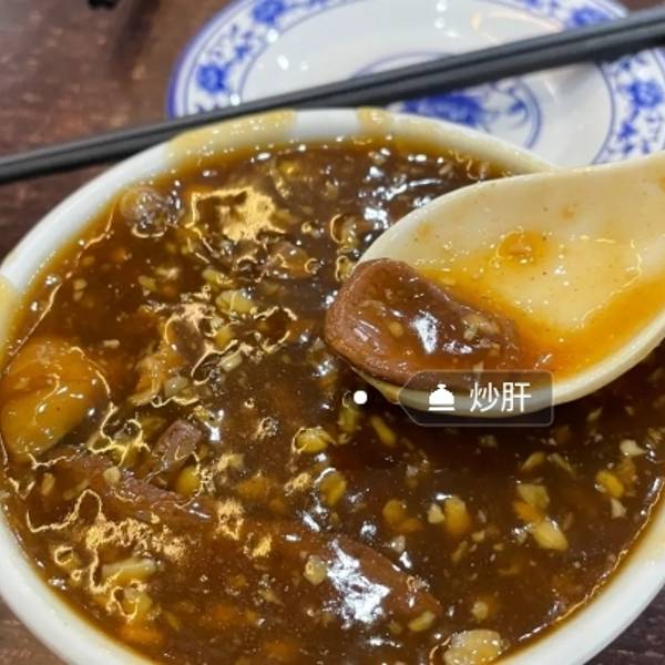 老北京炒肝当地特色,应该加了淀粉调和才会黏黏的感觉,炒肝里面有肥肠和猪肝吧,东西略少主要是汤汁,那股味还很特别,加了蒜末和卤料的汤汁味道喝起还不错!