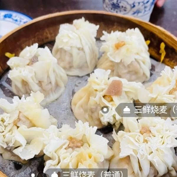 烧麦贵是有道理的三鲜里面应该有虾仁莩荠肉等很好吃服务也不错里面装修古香古色从我们的停车场上楼很近就吃到了美食下回尝尝别的附近好吃的太多