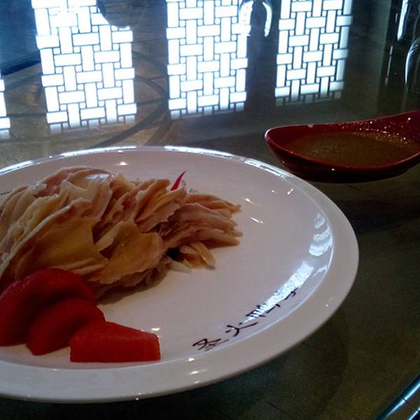 这次是第三次在北京吃全聚德烤鸭,一次比一次好吃。一段时间不吃就会想的那种,一般上来后先片一块胸脯上最脆的肥而不腻的肉,可以蘸面酱也可以沾白糖吃,很好吃。最喜欢的还是经典吃法,一张煎饼,沾着酱,放着葱丝黄瓜,再卷几片鸭肉,大口的嚼起来,非常过瘾啊!片完肉的鸭子拿去熬汤,提供鸭骨汤,不过我喝不惯,有些腻,受不了这个味。那个辣辣的是羊杂焖罐,味道不错,推荐,还有芥末鸭掌、火燎鸭心、青椒鸭肠都不错。
