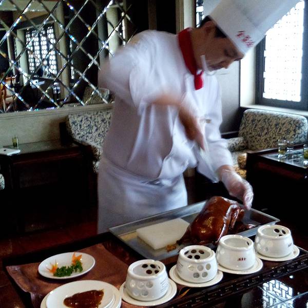 我的品尝时间:2013年端午节小长假。就餐时间下午5点左右。一进门就坐电梯上了4楼,进的店门右手边透明玻璃里挂着很多待制作的烤鸭,很有意思,进到大厅,应经坐了一多半的人,赶紧落座,晚了就没位置了。我们3个大人一个小孩,服务员建议我们点一整只鸭子,我们又点了2个凉菜,鸭子上来后当着我们面厨师进行刀工的表演,片的真薄啊,放在蜡烛灯上面加热,凉了味道就变了,再配上北京甜面酱和葱,卷上面饼,黄瓜,真是美味,鸭肉入口即化,真是名不虚传的享受。用餐费用400元。没点酒水。用餐时间中午和晚上最好提前半小时去,晚了的话要排队等候的。