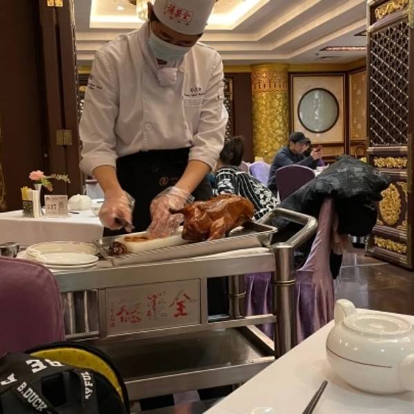 服务员态度很好,问我是第一次来的吗?我说是的,她就介绍了一下全聚德的历史什么的,点了鸭子上海,师傅就在边上当着面把鸭皮削下来,刀功很好,又薄又脆,咬开有油的感觉,拌着面皮,酱料还有葱和黄瓜一起吃,味道真好。感觉第一次端上来的鸭皮最好吃但量最少,第二次量较多但是味道稍逊,后面就是一般的鸭肉什么的了。以后有机会还是要来吃的,另外还可以买真空包装的带回来送人或者自己吃,价格比现场吃的便宜,但是味道么自然没法和现场的热腾腾的新鲜鸭肉比了