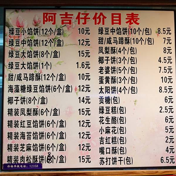 大元路的阿吉仔是家老字号。下午三点去的,前面排了有十来个人。排到时,咸的马蹄酥已卖完,只能买甜的,12个一盒,11元,便宜吧。买了8个装的绿豆大馅饼,口味不是很甜,好吃,这个我个人推荐。 另外吉治百货楼下也有家阿吉仔,礼盒装的,价格要高很多,一盒要多2、30元。据说少糖少油,更健康。 不过自己吃的话,还是推荐大元路这家。