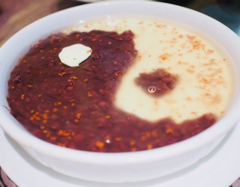 🥢【红豆乳酪羹】做成阴阳八卦状,一半红豆一半乳酪,略甜,上面是淋了一层糖桂花,乳酪部分很绵密。