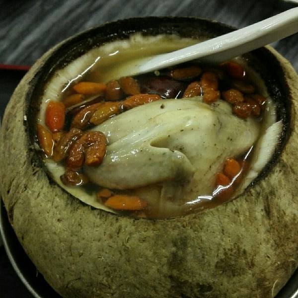 - 不过材料不马虎,一个椰子炖汤,里面还有刮出来的椰子肉,而且一个汤里面也有四五块竹丝鸡,怪不得香...