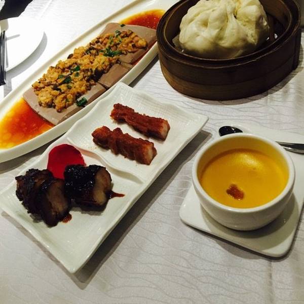 朋友请吃饭约了这家旗舰店,应该也是广东粤菜系的代表之一,店铺果然很大排场,楼上有包间和大厅,装修也挺有风格的,朋友推荐了他们家的烧鹅和烧腩叉烧,还有比脸大的菠萝包哈哈,三个人四个菜吃得刚刚好,可惜上菜来都不太热乎,服务员态度挺好的,又端回去换了一拔来