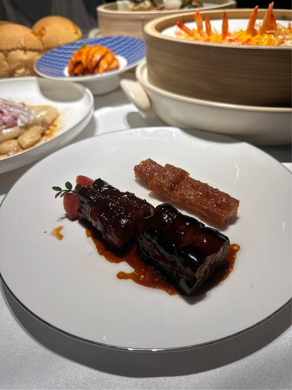 好味汁凤爪,其实就是豉汁凤爪,整个凤爪入口即化,蒸煮的过程也让酱汁更为浓郁,下面一直有明火温着。脆皮叉烧,一口咬下去,只有香味,没有油腻味。