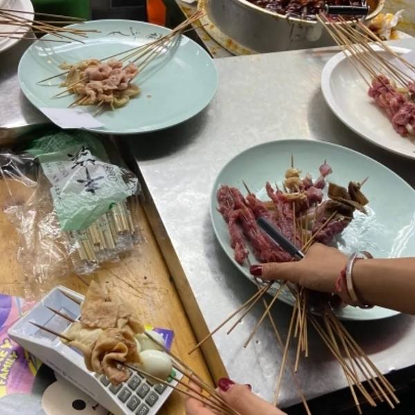 第一次来这条街,简直发现了新大陆,好多吃的,好热闹!哈哈哈哈影有烧烤和串串,朋友说的串串更好吃,所以我们点了很多串儿~