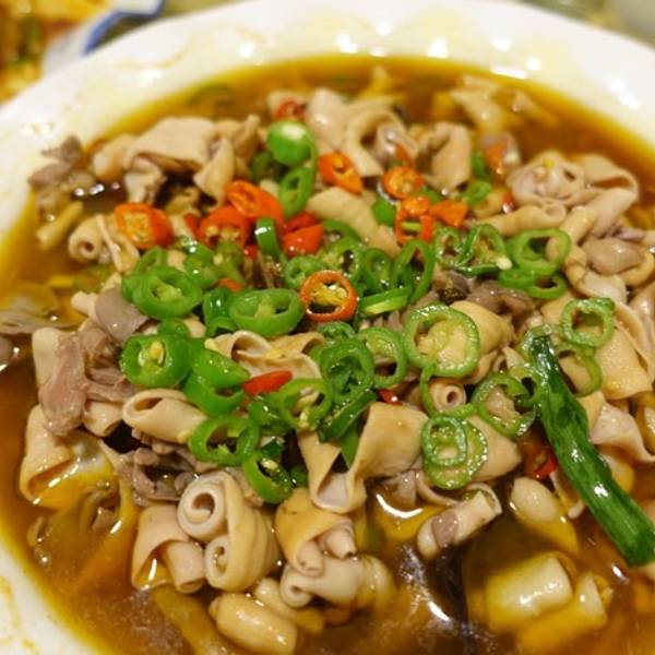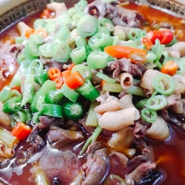 呛香鱼。带丝汤。荷叶酱肉。水豆豉鸭肠。饺子肥肠。霸王黄喉。葱香腰花