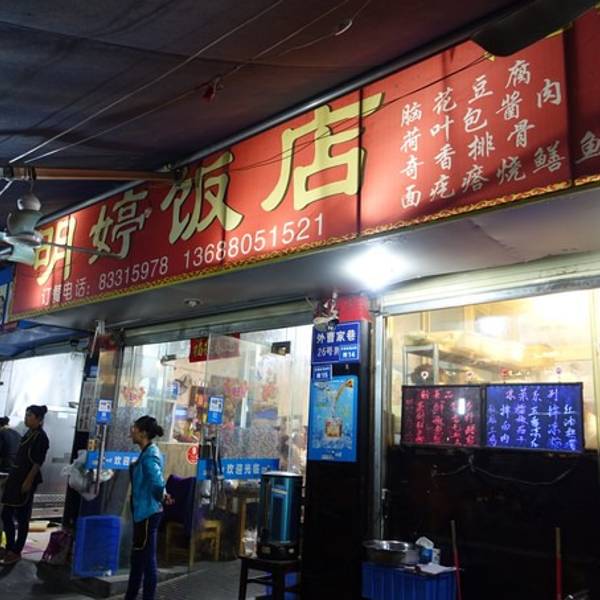 晚饭来到了舌尖上的[明婷饭店]。饭店虽小的不起眼,但是美味往往就是隐藏在这深深巷子里。 地理位置:金牛区 外曹家巷26号附16号(近马鞍南路) 交通方式:真的问一问当地人,没有不知道的。 人均:30-40元 服务:环境一般但是还算干净,上菜超快,翻牌率极高。 这是成都最有名的苍蝇馆子,具体位置坐落在曹家巷菜市场边的一条狭窄的小巷里,还被吃货誉为"成都最牛的苍蝇馆子"。我们知道这个地方也是通过各种攻略和电视节目。不然这个不起眼的小店和平凡的名字真的会被错过的。 由于我们有十多号人,看也不用看就把大众推荐的特色菜都点了个遍,果真吃饭还是人多的好。不大的地方挤满了人,上菜快,翻台率奇高。 荷叶酱肉,用荷叶包着的肉,带皮,很香,我不吃肥肉的人都蛮爱啦,推荐哟。 豆腐脑花,招牌菜呀,每桌必点。一大盘,脑花不少,像我这种喜欢吃脑花的人很喜欢,豆腐也很嫩入味,但吃多了还是有些腻,感觉比较咸。豆腐脑花傻傻分不清楚。 奇香排骨,过油炸过,酥脆酥脆的,。 能记起名字的还有这些: 呛香鱼。带丝汤。荷叶酱肉。水豆豉鸭肠。饺子肥肠。霸王黄喉。葱香腰花 服务方面也还好,下单上菜什么的都挺快的哈。 这里只放了几张图片,其他的去看我的游记咯。 每每深夜的时候看到这些图,我都要饿死了