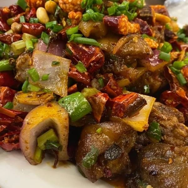 老妈蹄花点了个小份的蹄花,小小一碗,芸豆和猪蹄煮的很软烂,入口即化,汤口偏淡,但是猪蹄蘸上搭配的辣酱,酸酸辣辣挺好吃鲜椒兔兔肉切的很小颗,肉应该提前腌制过,有点软,整体不会很辣,还行