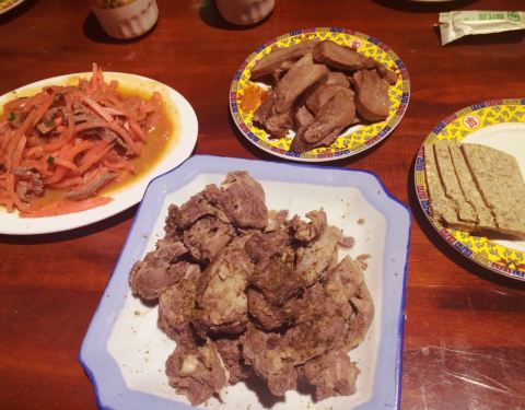色拉寺出来,又是晚饭时间,再一次尝试了藏餐,在东措边上的雪山尼玛餐厅,这家还不错 中央的是特色菜羊肺,羊肺上面是牛舌,右下角的糌粑就不推荐了,左下角咖喱饭和平时吃的差不多,不喜欢西藏特色菜的可以尝试