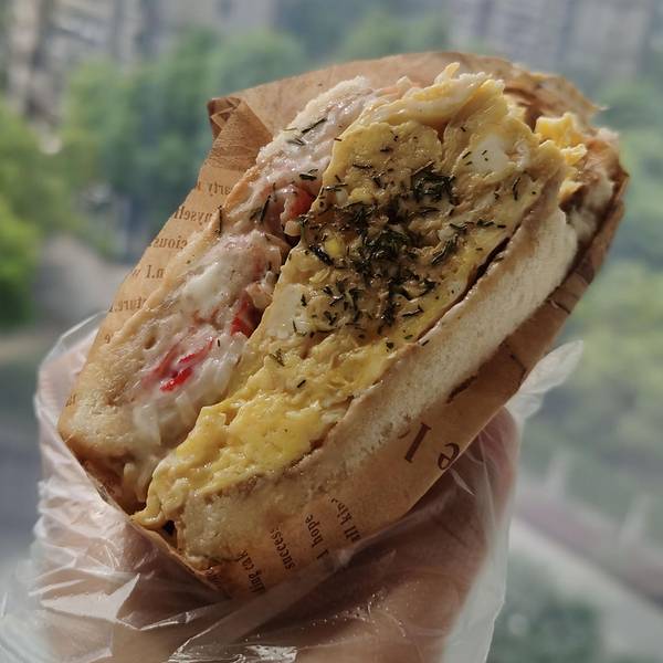 安利一家外卖“谁知小馆”厚蛋蟹肉 三明 治,太好吃了,鸡蛋超级嫩滑。这个好吃,黄酒味的布丁,很有创意