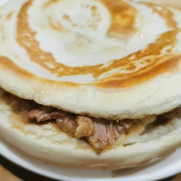 肉烂咸香,虽然是肥瘦但是一点都不油腻,刚烤出来的饼咬一口脆脆的,和肉完美融合,