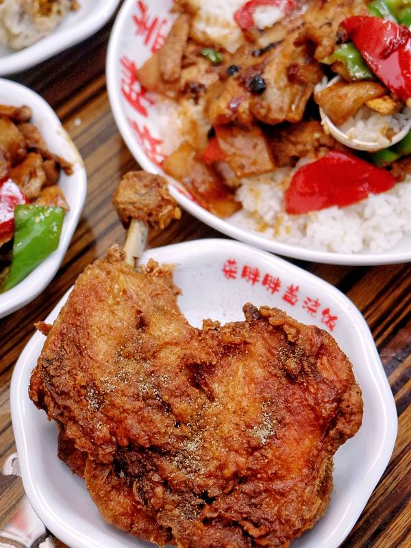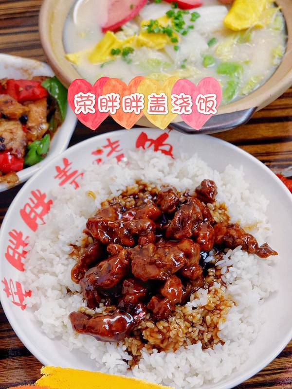 🌟💕荣胖胖盖浇饭💕🌟 看到南京西路美食一条街人流量非常大的吴江路上很醒目的怀旧风大招牌就是他家了,盖浇饭式的家常味道在这里可以吃到,可以直接单点浇头也可以点盖浇饭,有室内座位和露天座位,点单后阿姨会送上桌。 🍖糖醋里脊盖浇饭🍖💰38 真滴是满满一大盆肉肉呀,里脊肉切得很大块肉质依旧很嫩,浓油赤酱的色面酸甜开胃,肉祖宗最爱纯肉盖浇饭酱汁拌饭最嗲。 🍛回锅肉盖浇饭🍛💰42 很有烟火气的菜做好吃了会特别香,依旧分量十足搭配了青红双椒和豆腐干,肥瘦相间的五花肉肥而不腻微辣调味适中适合配饭。 🍲全家福砂锅🍲💰49 有单人份的也有双人份的,小时候的味道汤很鲜美,蛋饺加入了马蹄口感脆嫩,还有大红肠粉丝黄芽菜一锅下肚仿佛过了个年。 🍗手枪鸡腿🍗💰29 比脸大的大鸡腿上桌后被香到了,金黄诱人表皮超级香脆内部鸡肉依旧多汁鲜嫩,撒了特质调味粉也加分了,适合2人share。 💫咸蛋黄烧麦💫💰6 哇哦令人惊艳的咸蛋黄烧麦,咸蛋黄小迷妹可以吃2个,个头比一般的大一些,包裹着一整颗口感沙沙的咸蛋黄,糯米很绵软稍微冷掉一点吃也没有变硬有点甜蜜蜜的酱香。 今天5月13日还有🌈5.8折🌈约上小伙伴一起去吃可以多点几个品种非常划算了。