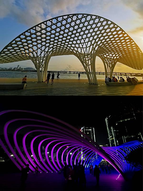 散步到欢乐港湾,得以近距离观赏湾区之光摩天轮,再往前就过不去了。这里是前海湾,也是珠江入海口,摩天轮的轿厢可以承载二十多人,站在轿厢上观赏海景和沿江高速桥,最远可以眺望中山。这里将是深圳未来的旅游聚焦点。与摩天轮相连的是滨海文化公园,一溜长堤,与大海零距离,却又不失现代气息。