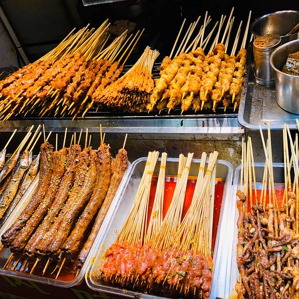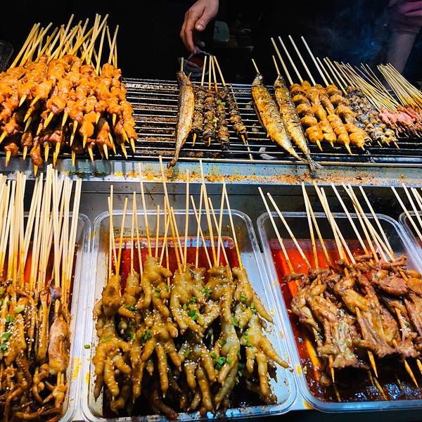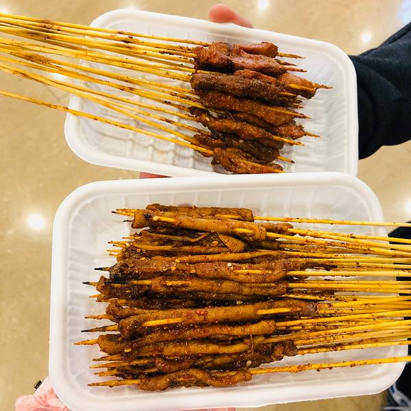 当我们逛到3楼时,各种小吃美食在诱惑我们,烤羊肉串,牛肉串,鱿鱼🦑串,鸭脖,鸭肠,鸡爪,牛蛙,面筋,秋刀鱼🐟,田螺肉等,还有每回我必吃的贵哥卤肉卷,隔着照片就已经想要流口水🤤了,这个时候我们需要补充能量,开启吃货模式!