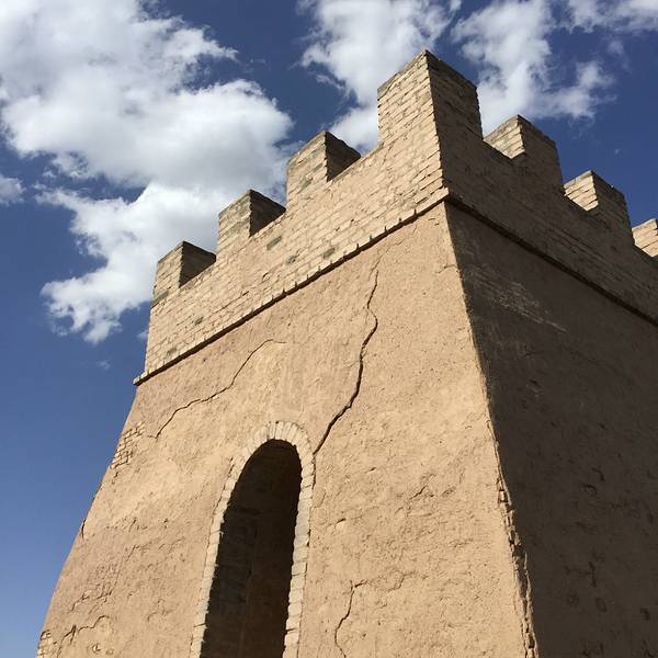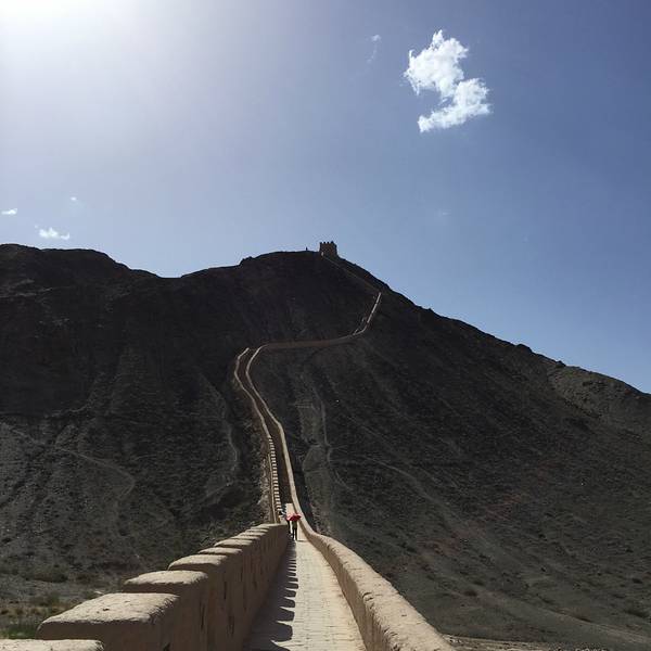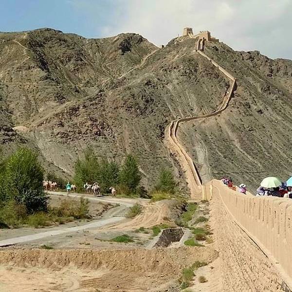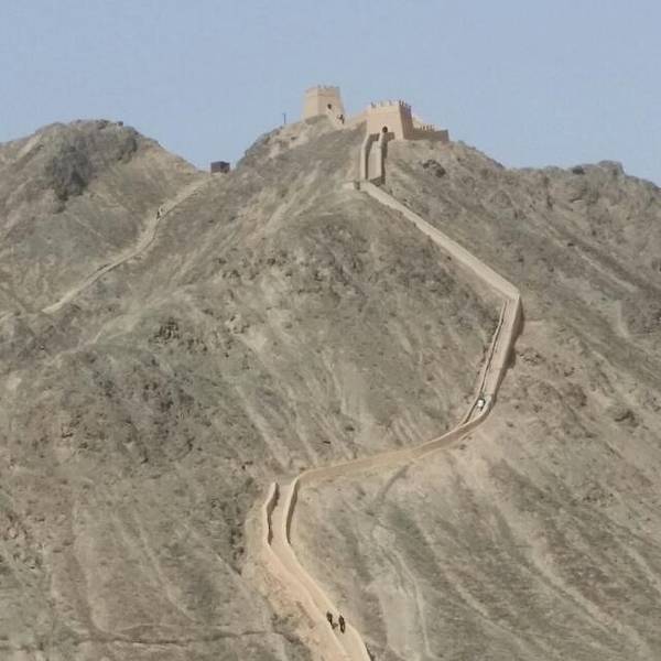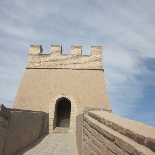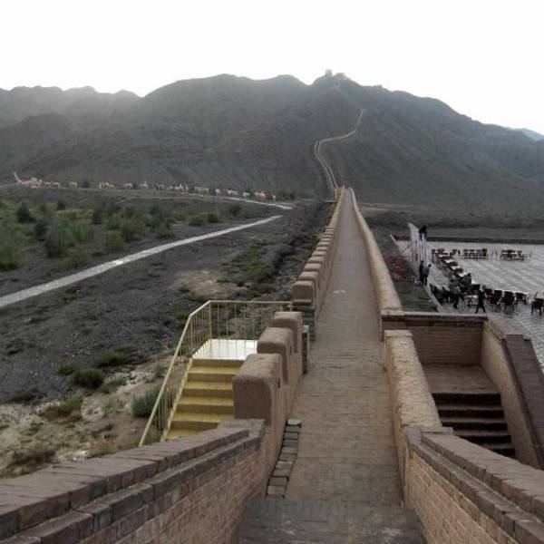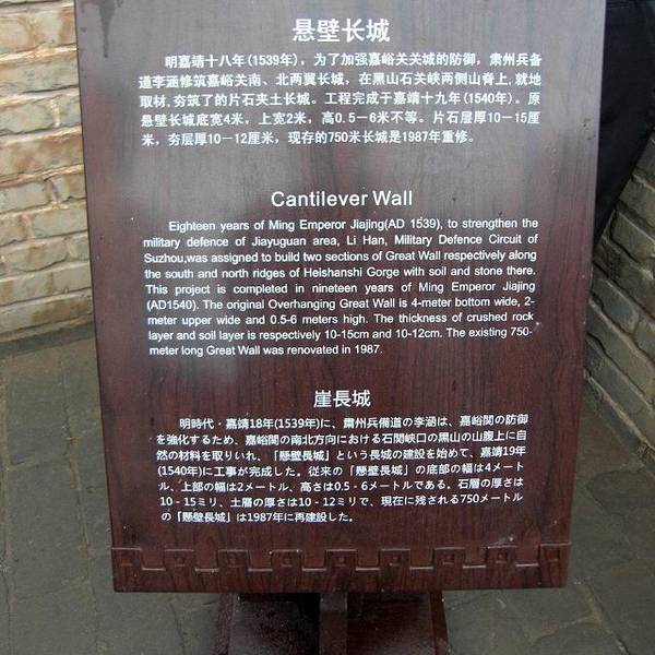 现在的750米长城是1987年修建的,其中有部分城墙悬挂在高150米、倾斜度为45度的山脊上,这里是古丝绸之路和明代长城的交汇点。由明嘉靖肃州兵备道李涵主持监筑。