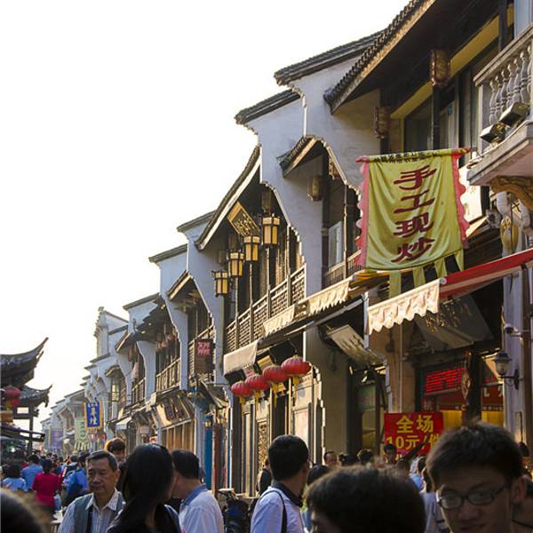 逛累了,可以去附近的河坊街吃点东西。河坊街是与南宋御街十字交叉的一条著名美食老街,呈东西走向。河坊街不算长,却汇聚了定胜糕、葱包桧、臭豆腐、油酥饼、酱鸭等著名杭州小吃。河坊街也是一条著名的历史文化名街,这里不仅有闻名杭州的“五杭”,即杭粉、杭剪、杭扇、杭烟、杭线;还有诸多老字号老房子,如胡庆余堂、方回春堂、太极茶楼、荣宝斋、张小泉、状元馆面馆、万隆火腿庄、胡雪岩故居、郁达夫故居等,随便哪个拿出去都是响当当的名号。