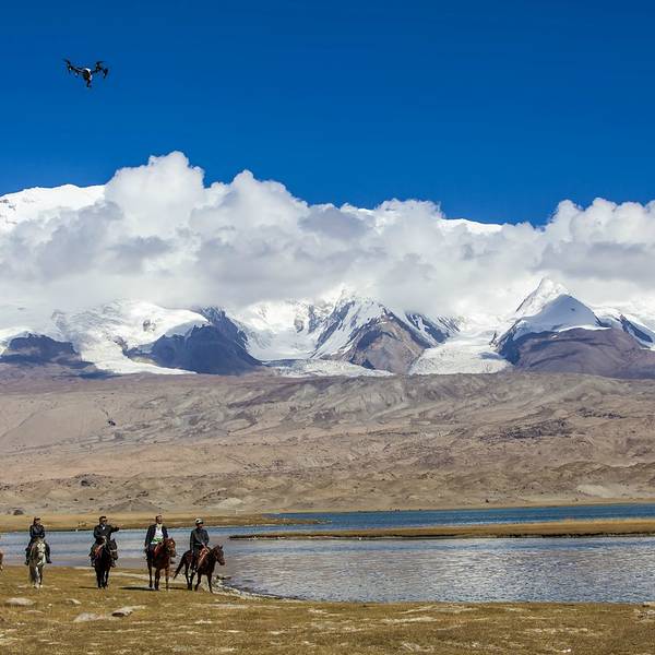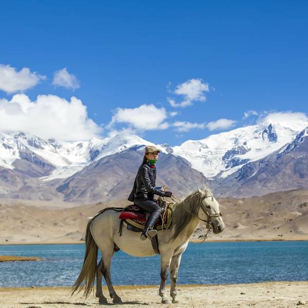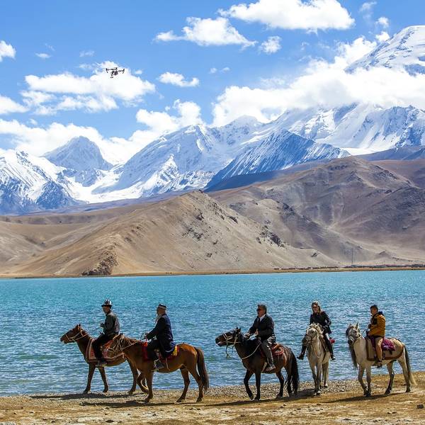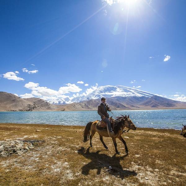 第二天从塔县过来一路下行还是很快的,在慕士塔格峰被雪山冰川迷醉的我们,还没有完全缓过神来,很快就回到了卡湖!由于时间相对宽裕,大家在这里肆意欣赏这冰山湖泊的美景。景区没有开发,还是非常原生态的,湖边有群牤牛在水边休憩,美景自然天成!有几个当地牧民在这里放了几匹马供游客骑马游玩拍照。受景色的魅惑,几个小伙伴禁不住到马上驰骋一番,拍照留念!尽管骑马许多地方都有,但这里,在这圣洁的雪山圣湖的映衬下,却是美美的景致与享受!天气非常棒,蓝天白云映照下的这座高原圣湖,在群山环抱之中显得更加光彩夺目,高耸的雪峰、已经发黄的草原和湖边畜群倒映在湖中,亦真亦幻,恍然穿越的感觉!在都市雾霾呆惯的大家,在这里让美景晃得梦境般的感觉!在湖边迷醉之时,幸运再次降临。当地旅游广告部门来次取景,几位维族同胞策马驰骋在雪山圣湖边,为这份美丽再添风采。尤其是一位可爱俏皮的维族姑娘,飒爽英姿,还时不时与我们开着玩笑!有时间的话,可以在这里住几天,体验一下当地的民族风情,做一回高原湖畔的游牧民族,赏美景,品美食,享受这人间难得的纯净天堂。