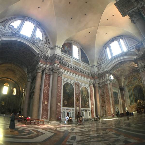 罗马的行程比较走马观花,主要是玩了11天后有点累了,还有一个重要原因是7月的罗马太炎热了,而且道路很宽有好多出口,罗马人又都不太讲规则,有点让人心烦。因此,我们就是随便逛逛,热了就去咖啡厅休息。 这个教堂挨着共和广场,里面空间构造很特殊,面积也很大,特别凉快,我们在这休息了一会。