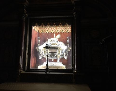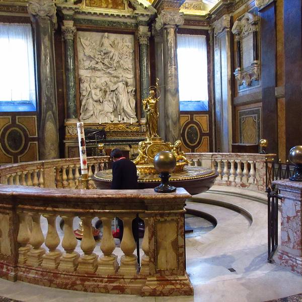 双子教堂左边的好像在装修,不能进去,右边的可以进去参观。在这能看到著名的镶嵌图案《下跪的骷髅》此处,据说其鬼魂经常在此出没。15世纪时由Bramante扩大整建。1513年,拉斐尔受银行家Agostino Chigi之托在教堂內修筑了Chigi礼拜堂。17世纪,出身Chigi家族的Alexander二世教皇再命Bernini对此教堂重新修饰。在...此处,据说其鬼魂经常在此出没。15世纪时由Bramante扩大整建。1513年,拉斐尔受银行家Agostino Chigi之托在教堂內修筑了Chigi礼拜堂。17世纪,出身Chigi家族的Alexander二世教皇再命Bernini对此教堂重新修饰。在这能看到著名的镶嵌图案《下跪的骷髅》。 展开