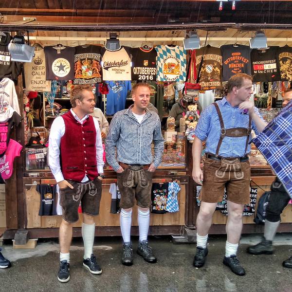 在慕尼黑的日子,正值啤酒节,虽然一直下雨,但也依然要体验下一年中最盛大的狂欢。搭地铁到Theresienwiese站下车跟随者穿着盛装的当地人很快就能到达庆典现场。 啤酒节的举办场地是在名为特蕾泽的广场上,除了啤酒帐篷外,还有各种游乐设施和纪念品商店。为了招徕本国顾客和接待来慕尼黑旅游的外国客人,慕尼黑的八大啤酒厂在广场上搭起巨大的啤酒大篷(德语里称“Bierzelten”)。每个帐篷里放有长条木桌和板凳,大篷的一端还有一个临时舞台,由民间乐队演奏欢乐的民间乐曲。帐篷一般可容纳三四千人,最大的有7000个座位。每一个啤酒棚一般都只提供一个酿酒厂的啤酒,为了突出自己的与众不同,每个啤酒厂都把自己的那个啤酒棚修建的富有特色而舒适气派。啤酒棚外部的装修标新立异,但内部大多都是一个格局,可以坐二十人的长条木桌椅排排摆开,会场中心是被鲜花和灯光装扮一新的高高的表演舞台,棚顶装饰着巨幅的绸缎和编织的花环,有的啤酒棚还设两层,楼上便是"雅座"。各帐篷里都由身穿巴伐利亚民族服装的女服务员给顾客送酒。不过,要想在大棚里喝到啤酒的话,并不是一件容易的事情,需要提前通过官方网站进行座位预定,通常情况下好几个月前位置都会被订满,想要去的话一定要及早下手(网站地址:http://www.oktoberfest.de/)。另外,啤酒节的入口会有安检检查,双肩背包是不能带进去的,要存放在收费的存包处。穿着巴伐利亚民族服装的人群。