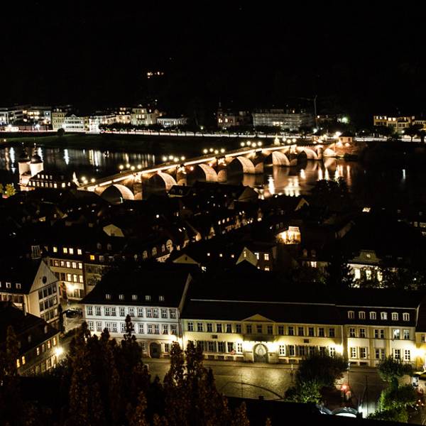 于这里,可以将整个海德堡小城的风光尽收眼底。 尤其是夜晚时分,小城虽然显得很安静,但是在灯光的点缀下,却并不孤寂。安静的内卡河,伴着优雅的夜色,令人沉醉。