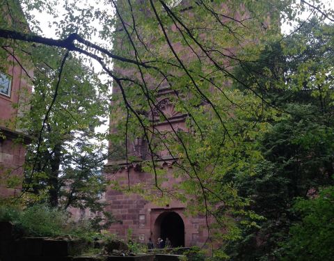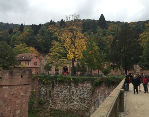 穿过海德堡老城区,从粮食广场开始,通过一段上行绿荫道,便可以行至城堡。经过一段坡度较陡的山路的爬行,走进幽暗的古堡内。传统扮相的护卫,看护着历史的遗迹,一丝不苟的照料,守候着千年文明;