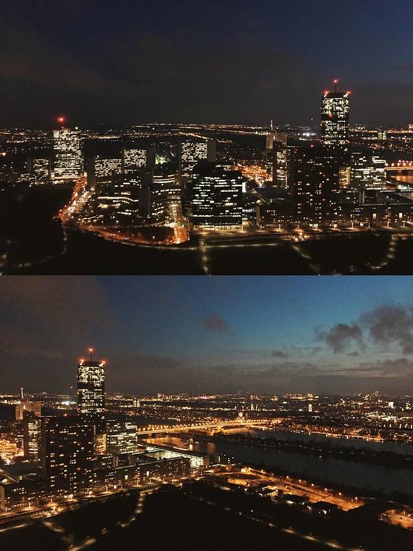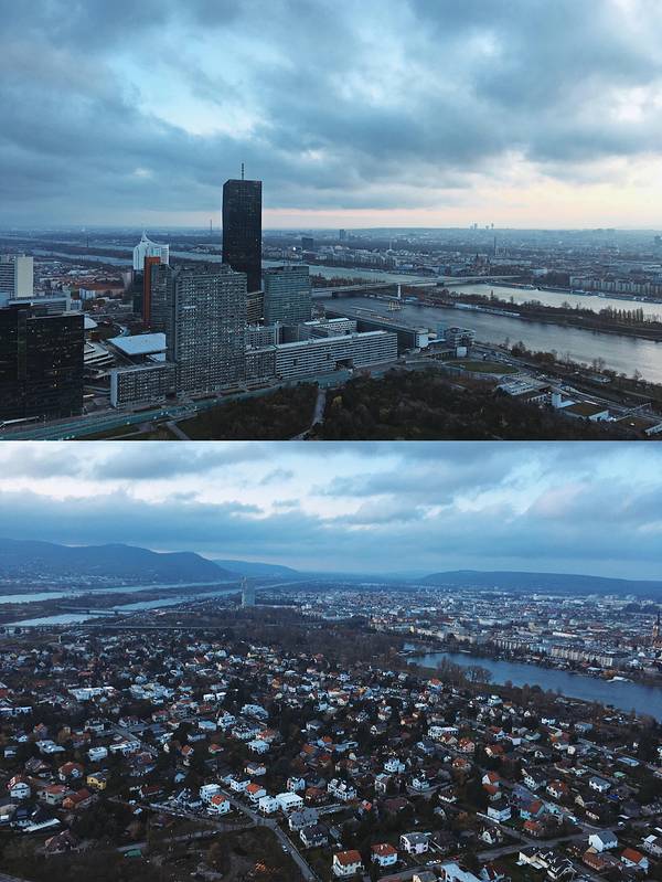 ...尖的,就是多瑙塔啦,多瑙塔俯瞰,维也纳联合国城尽在视线内,傍晚时分遥看维也纳老城,好美好美的呢