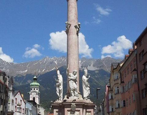 安娜柱是因斯布鲁克山城的象征,1706年,蒂洛尔州议会中享有特权等级的代表们共同出资建造了这根柱子,为的是纪念1703年巴伐利亚军队撤离茵斯布鲁克。这根柱子建造于7月26日,而这一天正好是安娜的命名日,纪念柱因此而得名。 安娜柱是一根红色大理石的柱子,柱头采用古希腊科林特式风格,在柱头之上有圣母玛利亚像,她神色凝重地眺望着远方的雪山。在安娜柱的基座上,还可以见到蒂洛尔的保护神和其他圣人的雕像。基座上有4个圣人雕像:北边是安娜,圣母玛利亚的母亲,西面是天主教博尔扎诺-布雷萨诺内教区的主保圣人,东面是天主教特伦托总教区的主保圣人,南边是圣乔治、龙和矛。