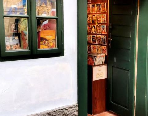 刚好一个小朋友穿着红色衣服经过榭寄生,太好看了。窗户展示,当年到现在,都是一种艺术。小商店,但是装修布置仍然好看。斑驳的墙面,总能找到这些墙绘画,可能叙述的是一个故事,有可能是当时的一种感想。搭配用心,当代都能参考。黄金巷不大,出来后可以沿着小路,到达玩具博物馆