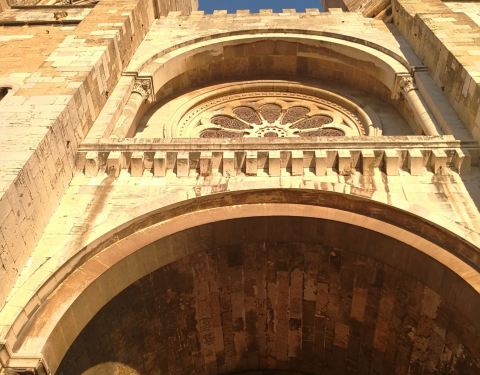 里斯本主教堂是罗马天主教里斯本教区的主教座堂,坐落在里斯本较古老的城区Alfama(阿法玛)地区,摩尔人统治时期这里曾是较繁华的地区。教堂经受过多次地震考验和重修,因此混合了多种建筑风格,包括罗曼式、哥特式和巴洛克式。 1147年葡萄牙开国国王D•Afonso Henriques(唐•阿方索)赶走摩尔人后下令改建,成为里斯本较早的教堂。这座教堂在建筑风格上自成一体,也可以说是结合了各个时代的不同风格,现在能够看到的教堂主圣坛,是年代较晚的巴洛克风格,但在大门两翼的雕像石柱上,还依然保留着精美的古罗马建筑工艺。罗马式的建筑配上哥特式的玫瑰窗,还有巴洛克式的大门等等,配合在一起一点也不违和、十分有趣,值得好好欣赏。