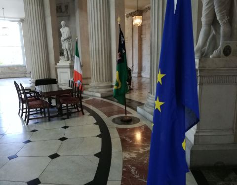 都柏林市政厅(爱尔兰语:Halla na Cathrach, Baile Átha Cliath)原为为“皇家交易所”,是爱尔兰都柏林的一座历史建筑,建于1769年到1779年,由建筑师托马斯·库利设计。都柏林市政厅位于城市的南侧的议会街尽头,毗邻1922年以前英国政府在爱尔兰的中心都柏林城堡。议会街建成于1753年,为利菲河北岸的卡佩尔街(Capel Street)的延续, 跨越新拓宽的埃塞克斯桥,因此交易所是一条长街的对景。皇家交易所拥有庞大的尺寸和精细的配件,反映都柏林在18世纪的地位和威信。这座新古典主义建筑包括一个中央入口大厅,有一个巨大的圆顶,由12根圆柱支撑,其周围可供商人漫步和 讨论商务。该建筑的功能是为都柏林商人提供一个聚会场所,可以在此买卖货物和票据。它也接近当时的海关大厦,位于今日的克拉伦斯酒店处,方便了海外客商。建筑的费用由爱尔兰议会提供,者体现在缩写“SPQH”,意为“爱尔兰的参议院和人民”。市政府原本坐落在西面四分之一英里的托马斯街中世纪的Tholsel,而在此之前,在“Thingmount”,现在是萨福克街。在18世纪会议在南威廉街举行。1815年,交易所的金属栏杆因人群拥挤而跌落,导致九人死亡,许多人受伤。因此在此建筑中的人群限制人数。在19世纪50年代,都柏林市议会购买了皇家交易所,将其转换为市政府使用。1852年9月30日,皇家交易所更名为市政厅,都柏林市议会的第一次会议于在那里举行。后来补充一系列壁画,代表爱尔兰的各个地区。