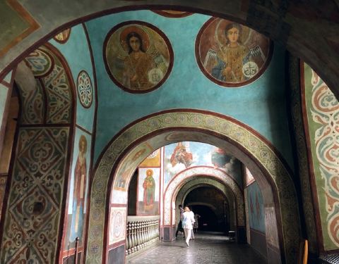 论文化意义上索菲亚教堂的确很重要,但是总感觉这个教堂商业化挺严重的。进去以后强行叫我出示在乌克兰的学生证,不然不给学生票(其他地方的售票处都是看我样子默认给我学生票),然后去个哪里都得要钱。。不过这也能理解,毕竟教堂的维护需要资金 论内容,索菲亚教堂里里外外还是不少有得可看的,当时我进去的时候教堂里有不少壁画,还有个现代艺术家展,感觉在教堂里逛这种展出挺有意思的,颇有一种博物馆的感觉。但是我感觉圣索菲亚教堂的总体氛围还是没有其他几个教堂的要好。