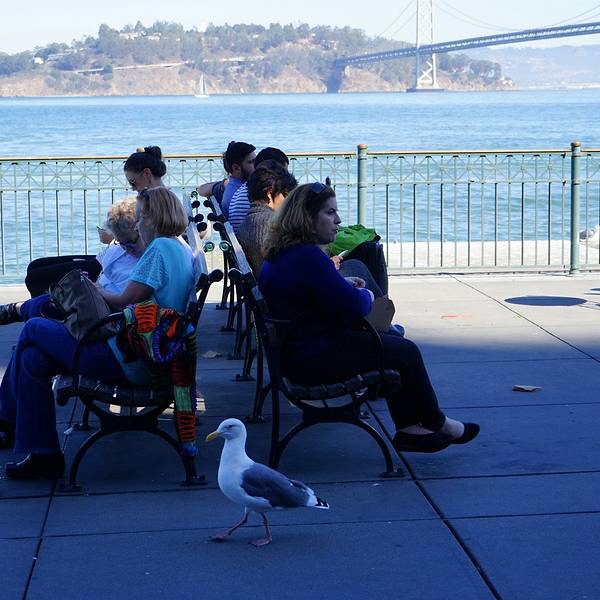 码头的背面 有公共座椅 有金门湾和奥克兰大桥的美景 还有海鸥在一边晃来晃去 刚真我能在这里发呆一下午虽然东航的四顿航空餐搞得我们挺饱的 不过吃货就是即使不饿也要满足嘴巴的存在 何况是到了半个地球以外的汉堡国