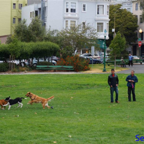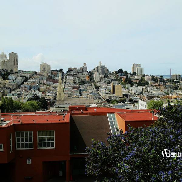 走到你刚要琢磨是不是走错路的时候,在你面前刚好就出现了一个广场,三五成群的人聊得欢畅,狗狗们更是撒欢儿的跑闹,这就是华盛顿广场Washington Square,一侧的教堂东北方向,还能看到Coit Tower塔。继续往前走...