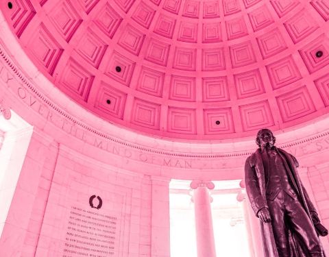 华盛顿纪念碑位于国家广场的正中央,555英尺高的方尖碑拔地而起,华盛顿特区明文规定周围任何建筑不得高于华盛顿纪念碑。 1. 一字不刻的方尖碑体 华盛顿纪念碑始建于1848年,1854年因南北战争而停建,至1876年才继续建造,虽所用石料均采自同一地点,但颜色却大有不同,是两段相隔22年的建造过程留下的痕迹。整个方尖碑通体光滑,没有一个字母,仿佛在告诉世人,华盛顿一生的贡献是无法用文字来描述的。 2. 纪念石碑的堆砌 华盛顿纪念碑的正方体碑柱顶端,为四面三角形的尖顶,如金字塔一般锐气逼人。内部中空,其内壁嵌有各个国家、美国各州市、各大团体及名人所赠的石碑193块,其中包括清朝所赠的文言文石碑,碑上文字取自福建巡抚徐继畲的《瀛寰志略》。 3. 登高远眺 纪念碑内共有897级台阶盘旋直上,你可以体验一步一个台阶的朝圣之旅,也可以选择乘坐电梯70秒直达顶端。在顶部瞭望台的四个方向设有8个观光窗口,可以远望国家广场东面的美国国会大厦,西面的林肯纪念堂,南面的杰斐逊纪念堂,也可以将潮汐湖的美景一览无余。
