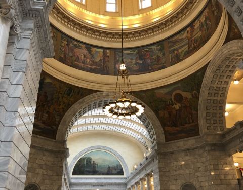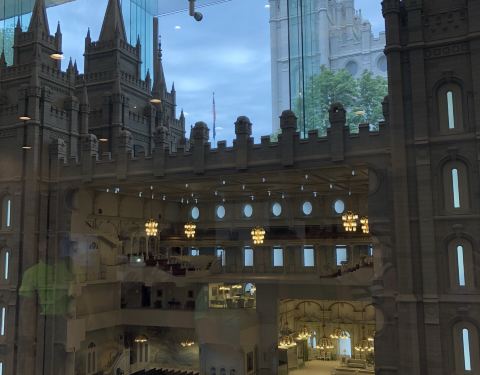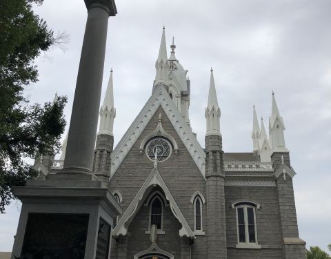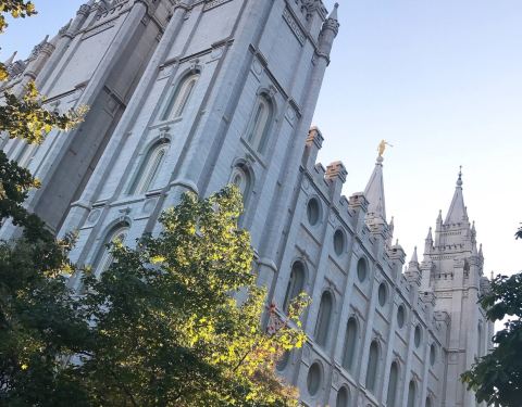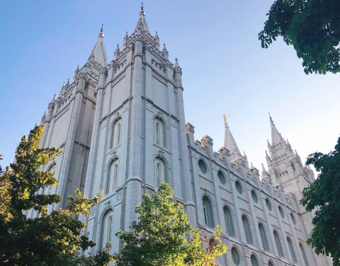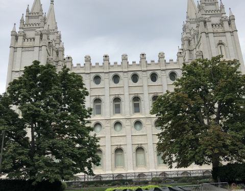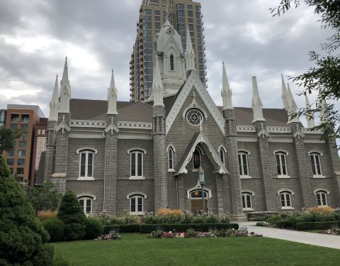 圣殿广场(Temple Square)坐落于盐湖城市中心,是犹他州盐湖城市中心一组属于耶稣后期圣徒教会总部的建筑群,包括魔门圣殿、盐湖城大礼拜堂、盐湖城聚会堂、海鸥纪念碑和两个游客中心,占地10英亩,周围有围墙环绕。历史悠久的圣殿广场占地面积超过14公顷(35英亩),周围有漂亮的花园、建筑和丰富的艺术文化遗产。圣殿广场以六个尖塔寺庙为中心,是耶稣后期圣徒教会的全球中心教堂。这里是犹他州很热门的旅游景点,有来自世界各地的义务导游,同时也是总部办公地、办公楼、大会堂、杨百翰故居等都在此。1830年约瑟夫·史密斯创立后期圣徒教会,提倡多妻制,他死后,更多的人跟随他的继承人杨百翰进入犹他,建设了盐湖城。