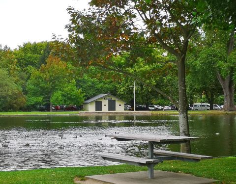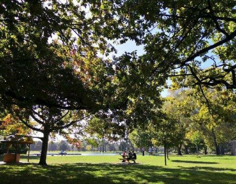 这时的温度非常舒服,一条河在公园穿过,草坪上不时可以看到休息的鸭子还没有落幕的夕阳已经没那么刺眼,公园的草坪很大面积。一条周长的跑道吸引着很多市民在跑步。这时的温度非常舒服,一条河在公园穿过,草坪上不时可以看到休息的鸭子。