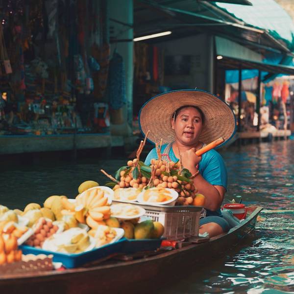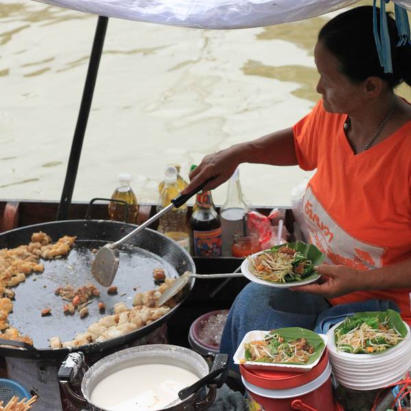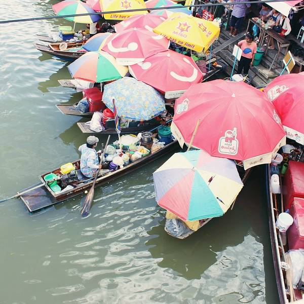 这是泰国最有趣的水上市场,没有市区里的繁琐和商业化,只是小本生意和小本买卖,小贩的船只上装满了美食和手工艺品。有的船上甚至支起了锅,在船上一边生火叫卖,一边烹饪美食。你只需要一个手势,一个眼神,他们就会过来和你交易。
