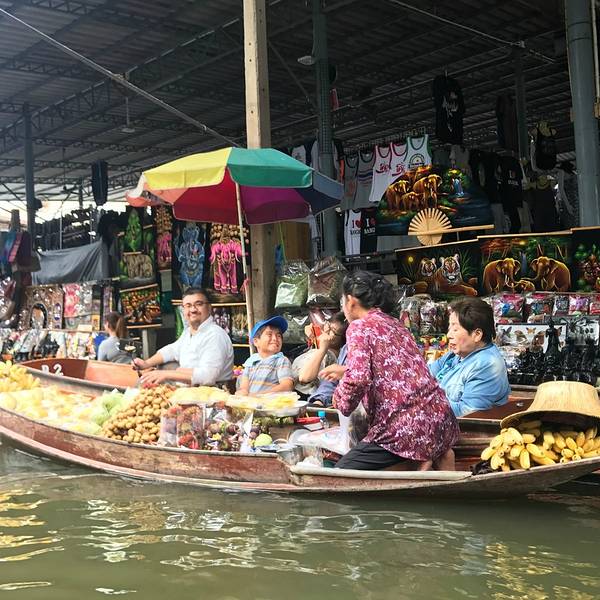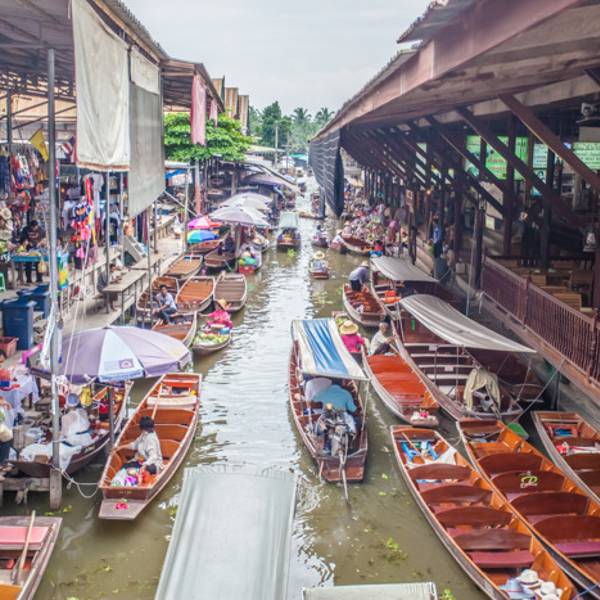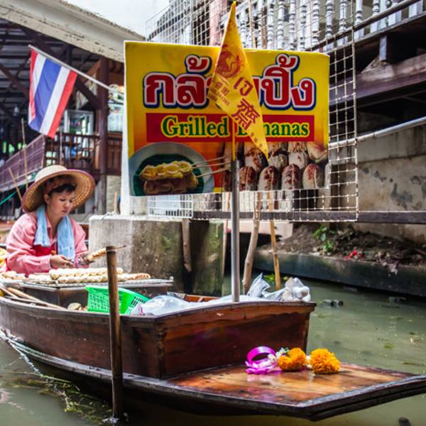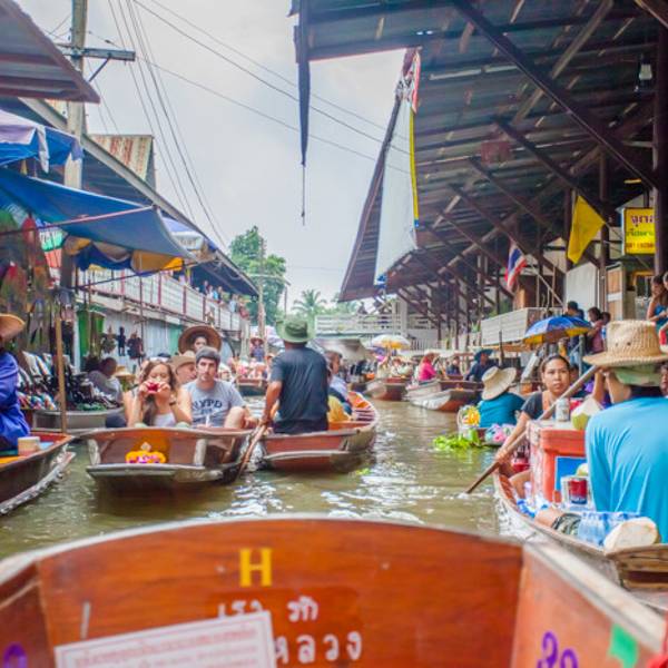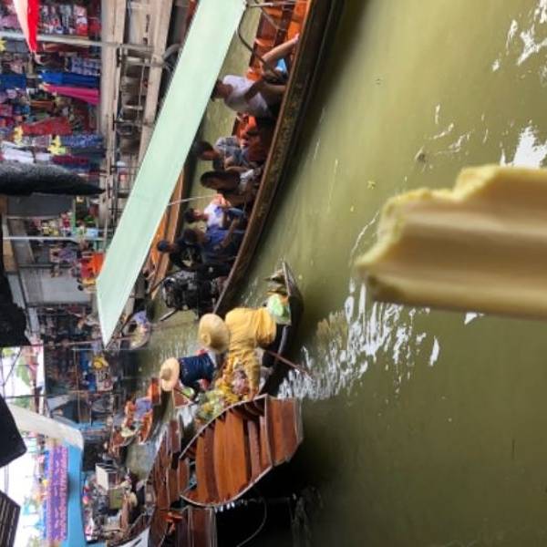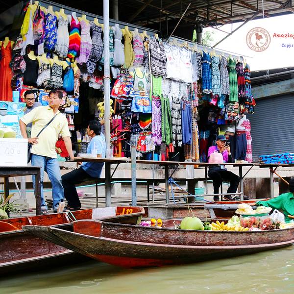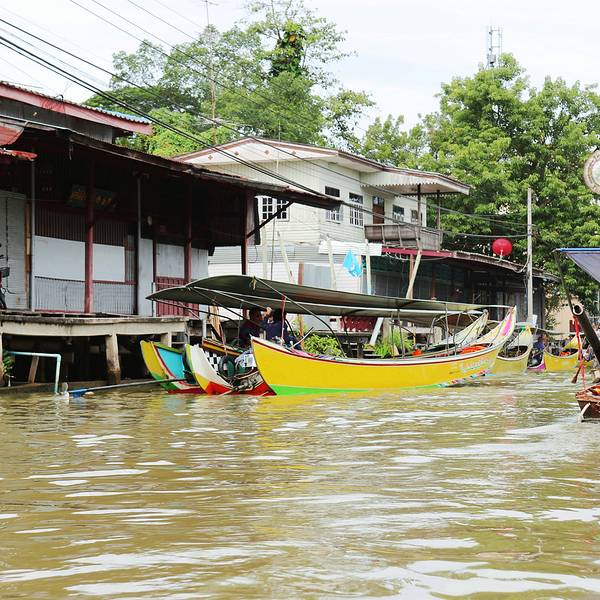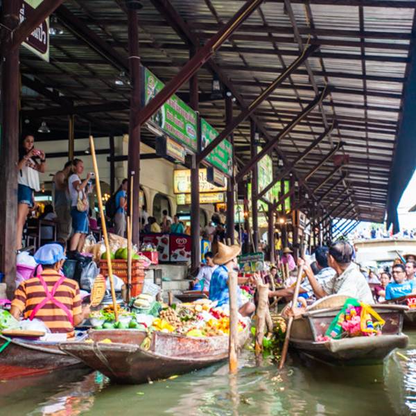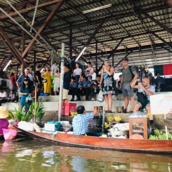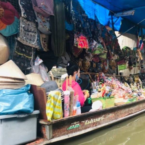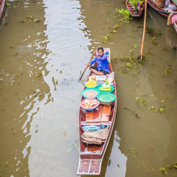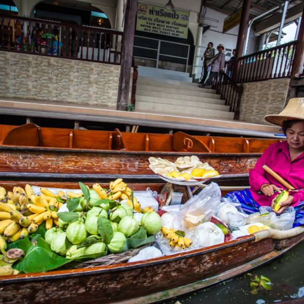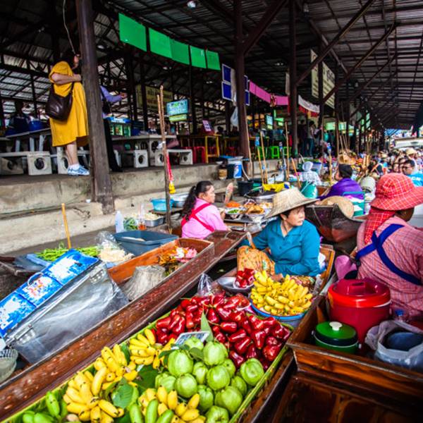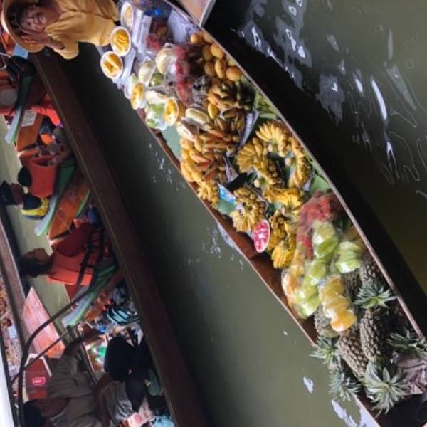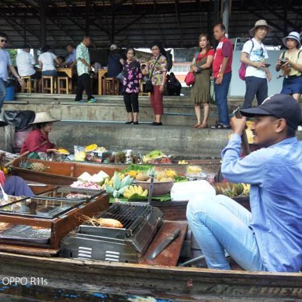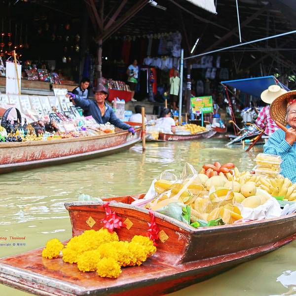乘坐小船游览水上集市,体验一下船上购物的乐趣。 品尝泰国米粉等当地特色小吃,吃芒果、莲雾等新鲜水果。
