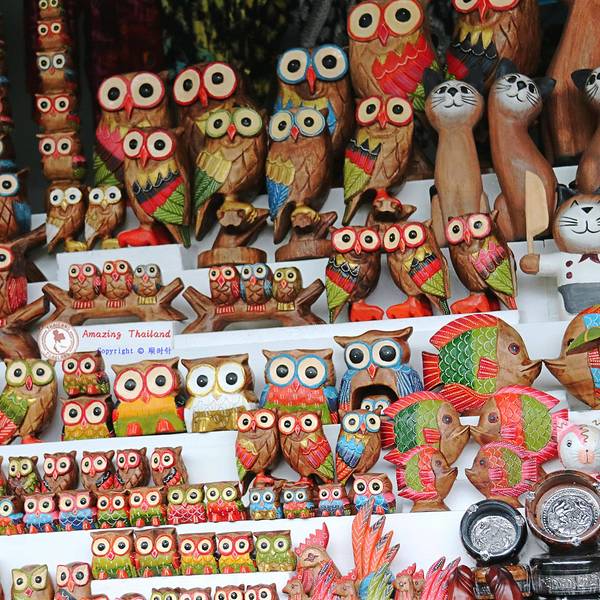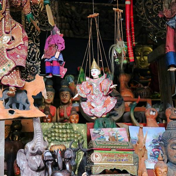 河岸两侧,还有很多精致的摊铺,出售各式工艺品,倘若喜欢,便可以交船家停至摊铺前,自己精心挑选心仪的商品。河流中央有些大的店铺,还可以将船停靠至岸边,亲自登上码头,于店铺中悉心挑选。