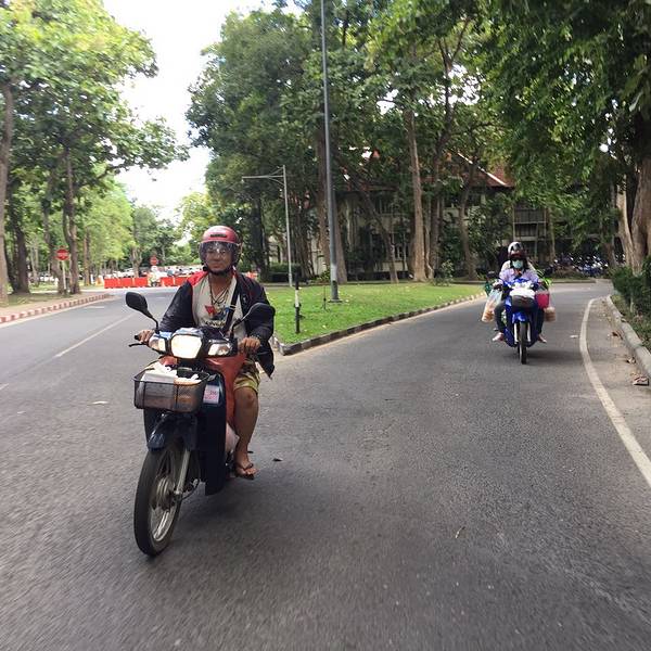 我们在古城内搭乘双条车前往清迈大学,人均30泰铢,车程20分钟左右。当然,你也可以选择搭乘嘟嘟车,约100泰铢(两人);或是骑自行车游览,自行车租金约50泰铢/天,不过会比较耗费体力。由于学校内不允许双条车等外来车辆进入,司机是将我们载到前门附近。