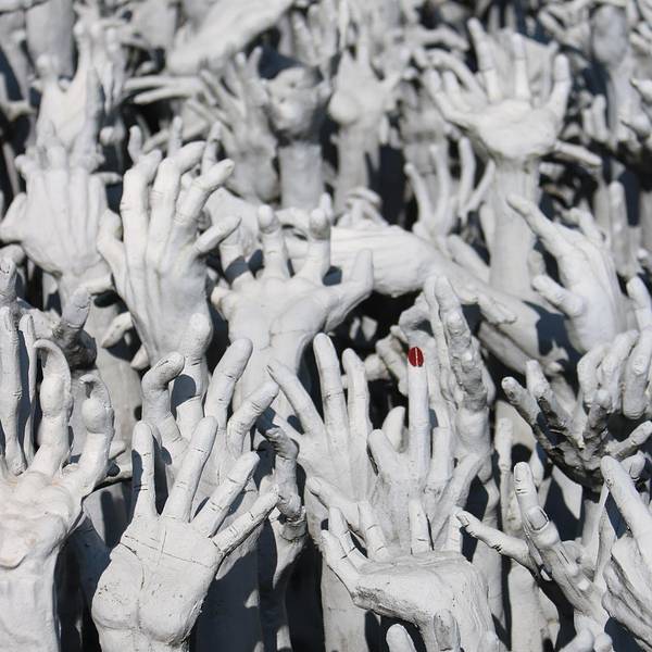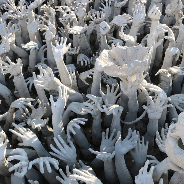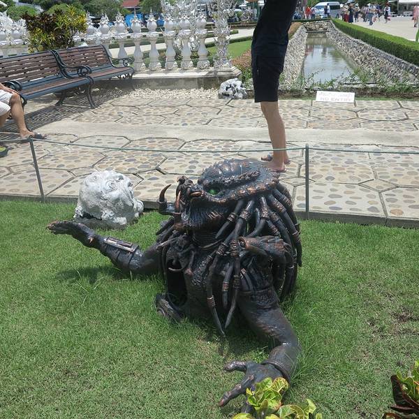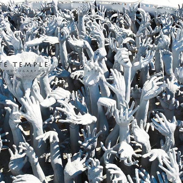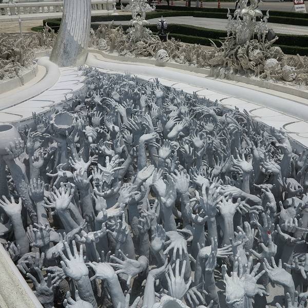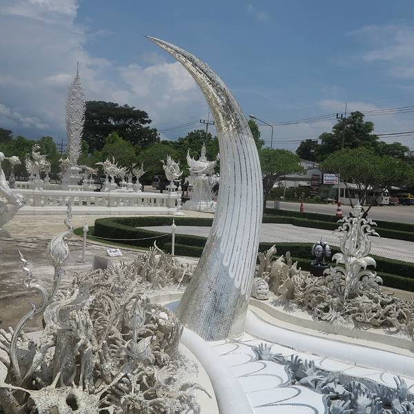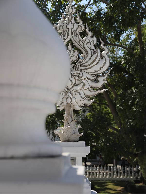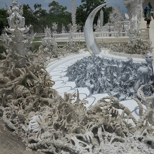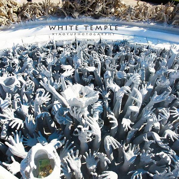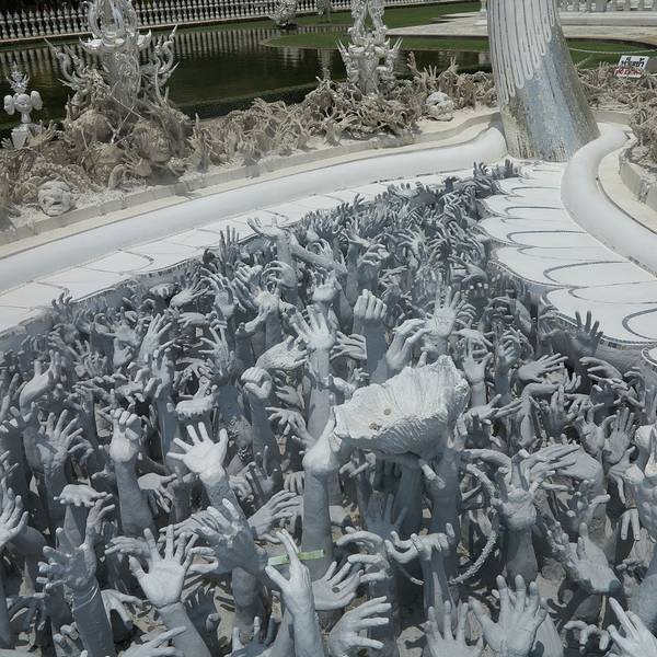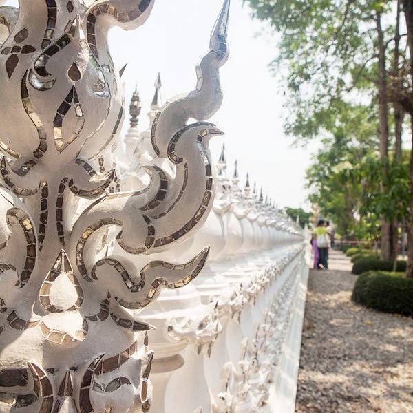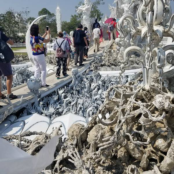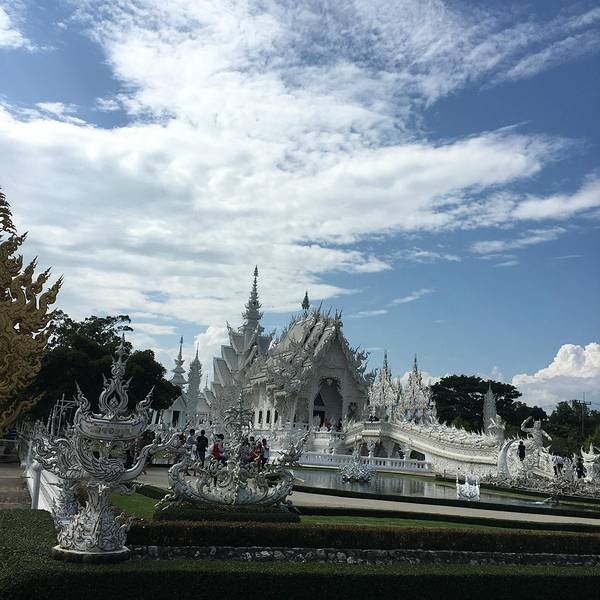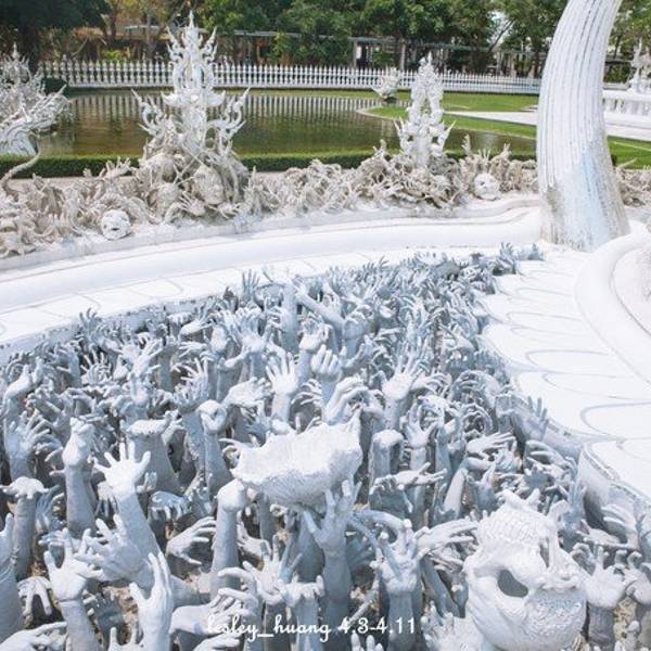 白庙,是我梦想到达的地方。很多年前,在网上看到白庙的照片以后,就说一定要去,后面清莱地震了,觉得很可惜。还好,在我来白庙的这一天,也算是遇见了它美好的一面,非常幸运,也非常难忘!如果以后有机会,一定还会再去!2013年清莱地震,白庙有一点点损坏,下图的手掌就是经过修复以后的了。还是有影响,但是整体白庙,还是非常震撼的!从正门走进去,不能走回头路。寺庙内是不允许拍照的。不过为了不错过白庙每一个在我看过的美丽瞬间,走了好几圈重复的路。泰国是一个以寺庙为主的国家,不过白庙在泰国,在全世界都是独一无二的。不得不感叹设计师的厉害,真是巧夺天工!摄影技巧小提示,穿蓝色的衣服在这里拍照会更好看哦![再见,白庙]